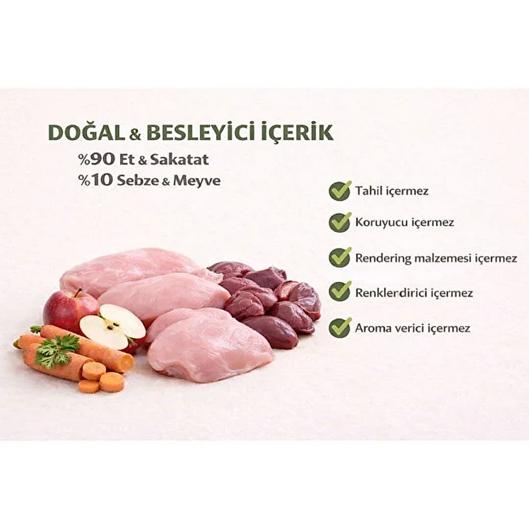 İçindekiler: Dana eti, dana karaciğer, dana böbreği, dana yüreği, kabak, havuç, kırmızı elma, E vitamini, taurine.